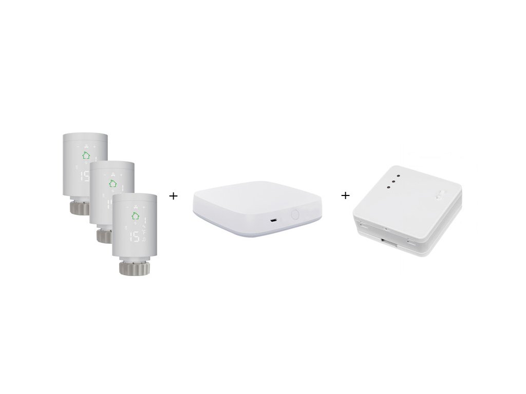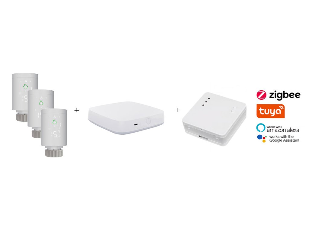 Základní set termostatických digitálních hlavic, centrální jednotky a spínač kotle vám umožní komfortní natavení teplot vytápění a spínání kotle na dálku. Ideální řešení pro rodinné domy, chalupy a víkendové apartmány. Můžete si kotel nebo topení zapnout ještě než tam dorazíte. Při příjezdu na vás čeká příjemně vytopený byt nebo chata. Snadná instalace a ovládání z mobilního telefonu nebo tabletu. Nastavení je prováděno pomocí mobilní aplikace Tuya nebo Smart Live pro ovládání Smart domácnosti.